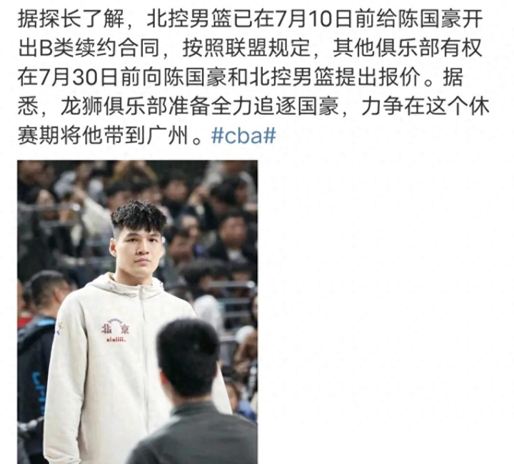 球圈赵探长率先爆料了解到的消息:北控男篮已在7月10日前给陈国豪开出B类续约合同,按照联盟规定,其他俱乐部有权在7月30日前向陈国豪和北控男篮提出报价。据悉,龙狮俱乐部准备全力追逐国豪,力争在这个休赛期将他带到广州。